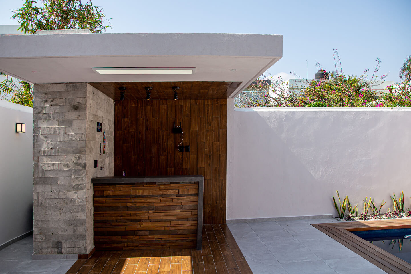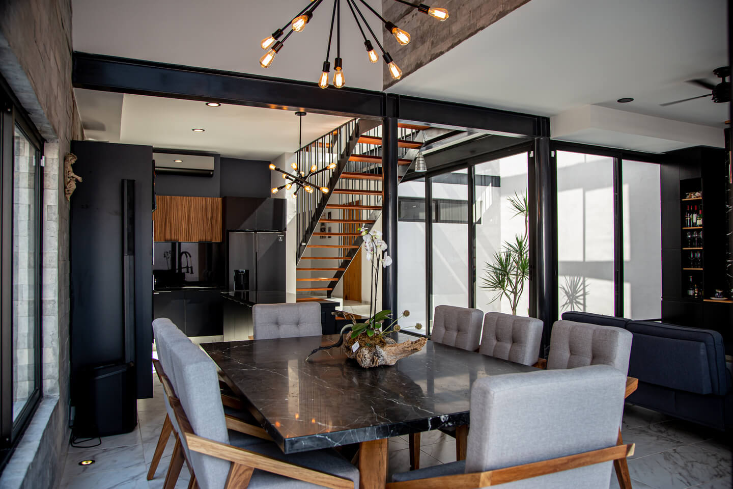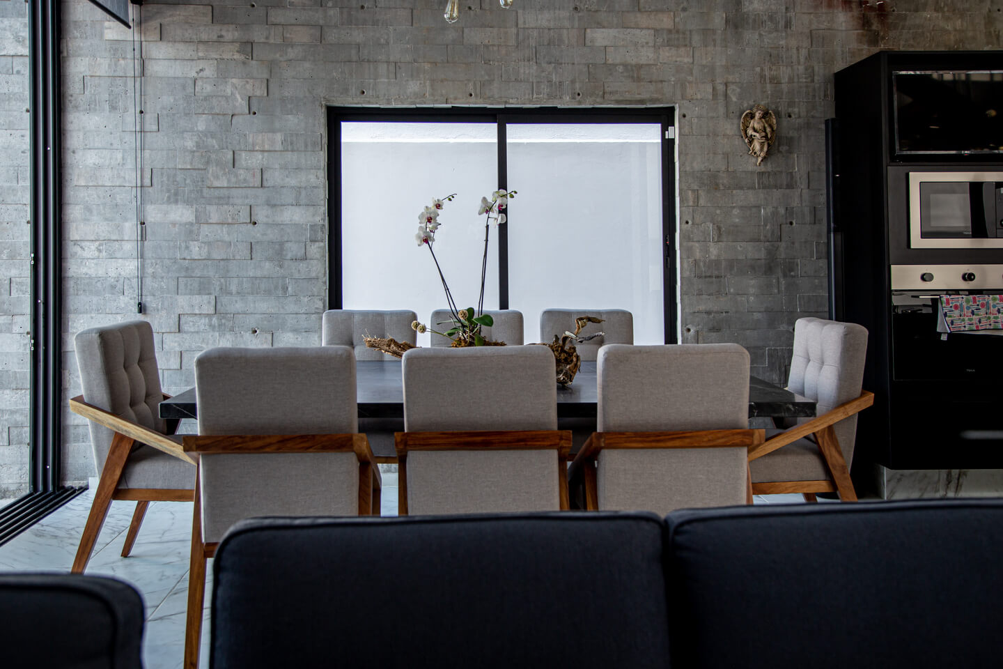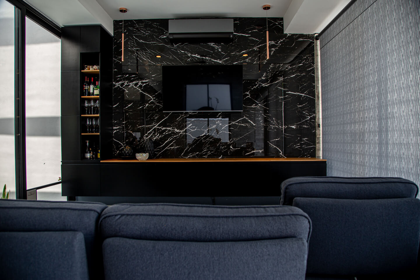 De manera constructiva, estos planos se resolvieron de concreto aparente. Se diseñó el tipo de textura tipo enduelado con distintas profundidades 3 y 6 mm, esto nos llevó a una labor artesanal por parte de los carpinteros cimbradores, sin duda trabajo complejo que valió la pena, ya que el final es asombroso. Además de estos conceptos se manejó un estilo industrial con detalles de brutalismo, lo que nos dio la respuesta para la paleta de materiales y de colores. Por ejemplo, la cocina integral es con cubierta de granito negro infinito, muebles y accesorios en negro y gabinetes tono madera natural tipo parota. Se diseñaron también muebles de habitaciones (cabeceras, credenzas, burós), de baño, vestidores, puertas, etc.