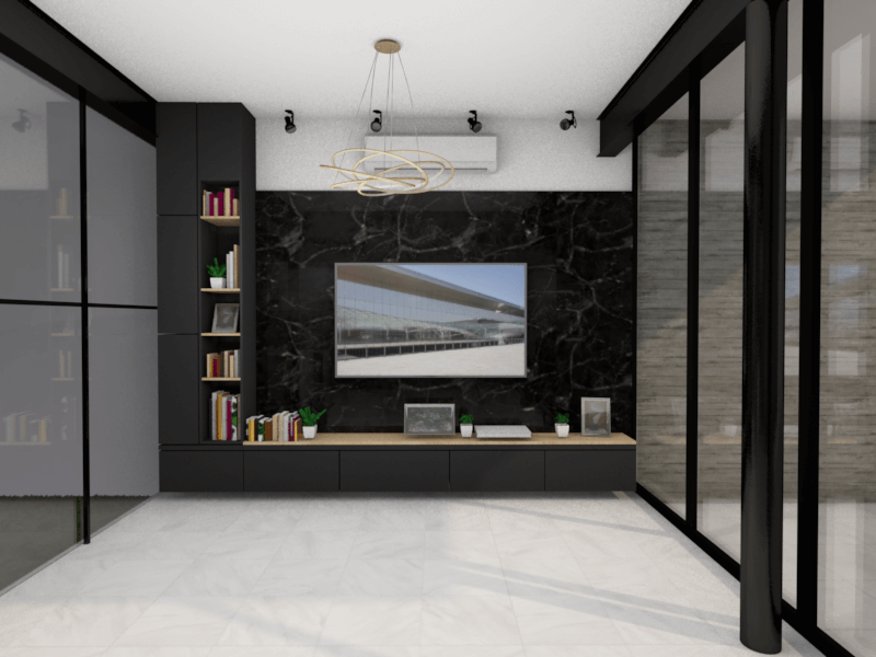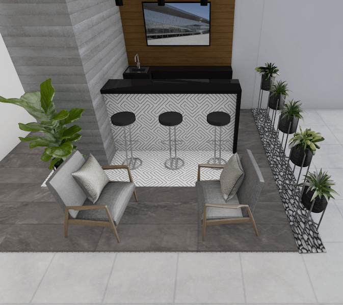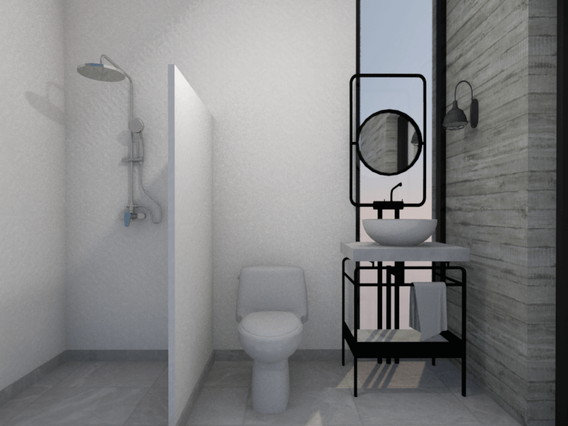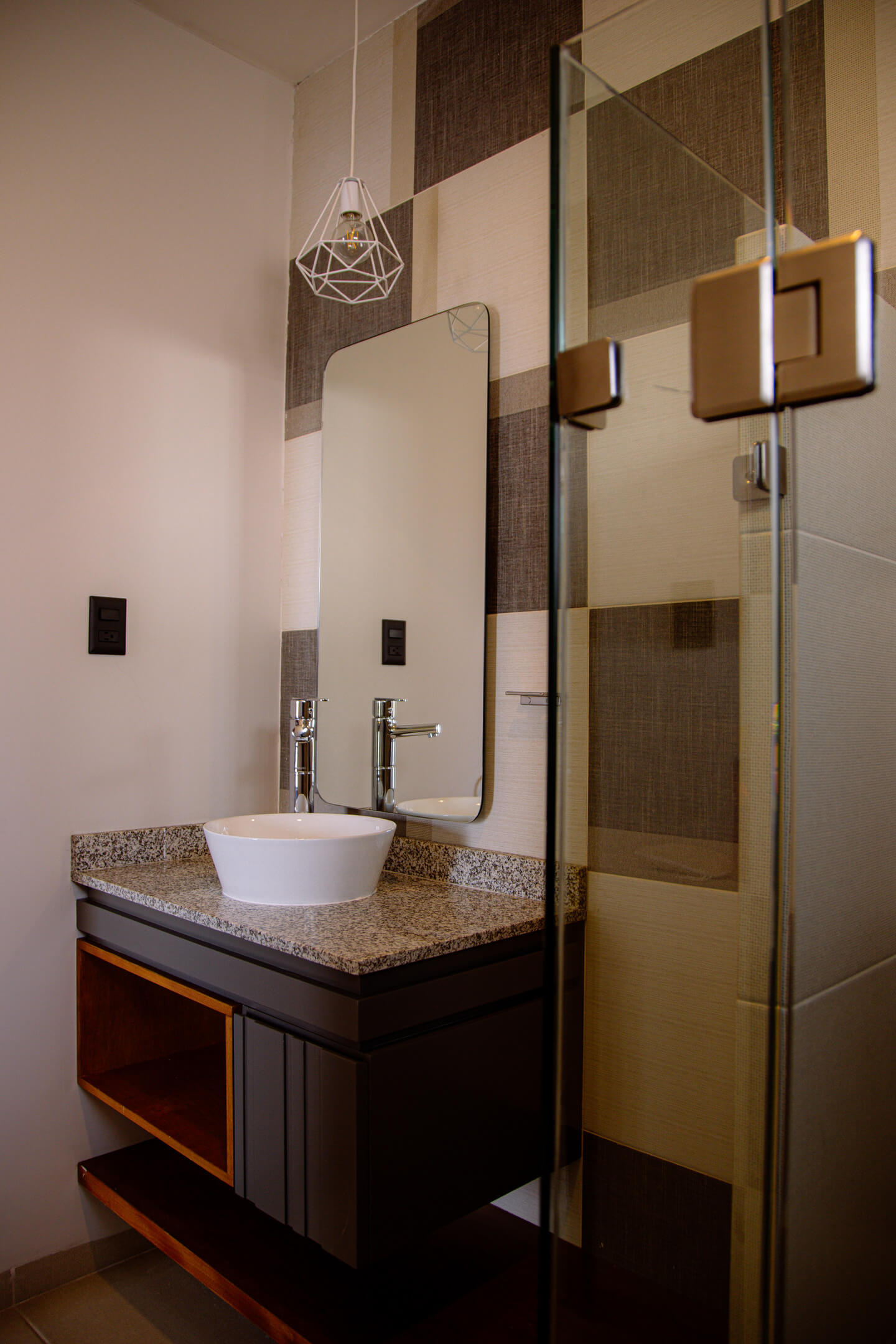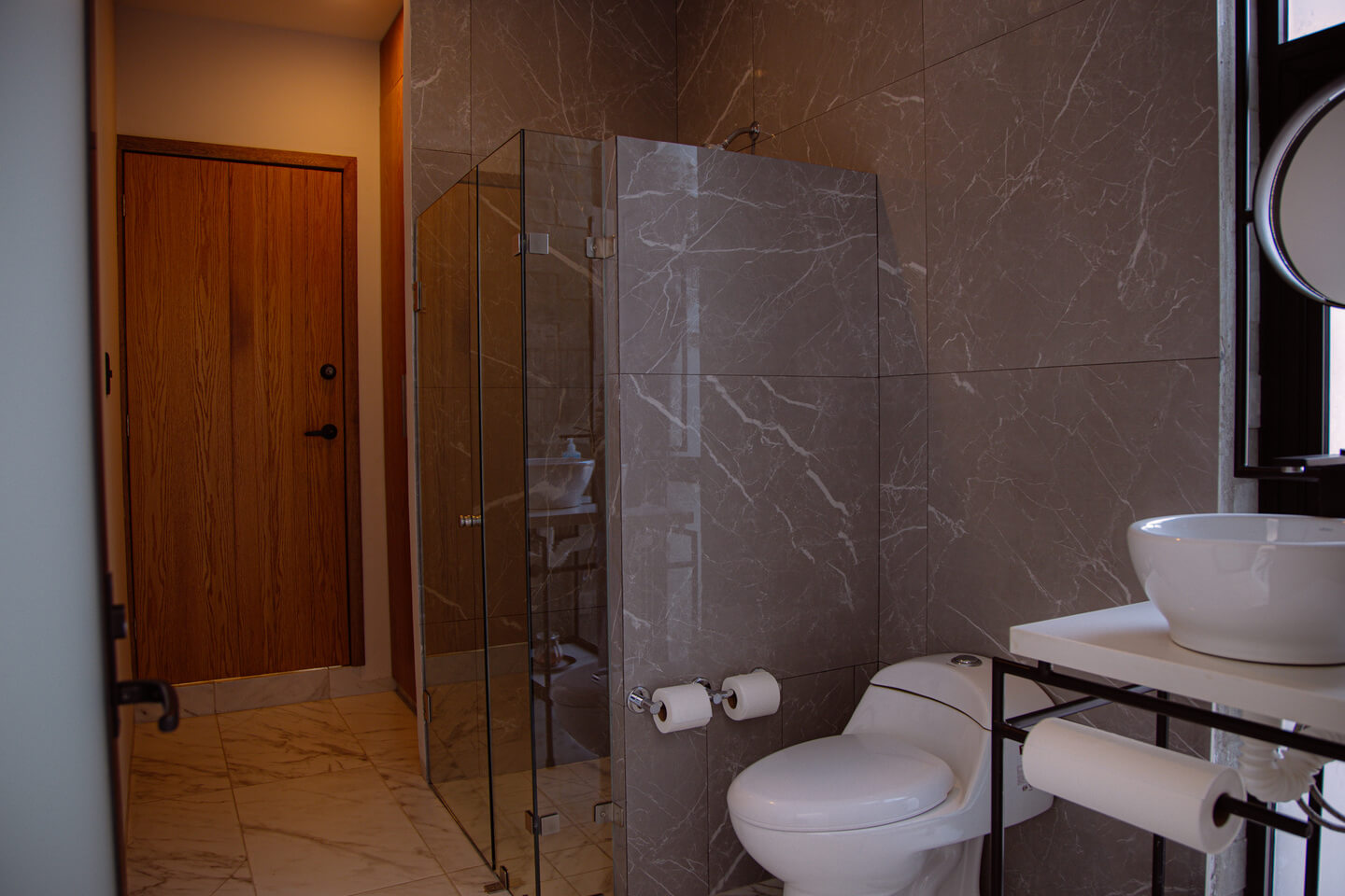 De manera constructiva, estos planos se resolvieron de concreto aparente. Se diseñó el tipo de textura tipo enduelado con distintas profundidades 3 y 6 mm, esto nos llevó a una labor artesanal por parte de los carpinteros cimbradores, sin duda trabajo complejo que valió la pena, ya que el final es asombroso. Además de estos conceptos se manejó un estilo industrial con detalles de brutalismo, lo que nos dio la respuesta para la paleta de materiales y de colores. Por ejemplo, la cocina integral es con cubierta de granito negro infinito, muebles y accesorios en negro y gabinetes tono madera natural tipo parota. Se diseñaron también muebles de habitaciones (cabeceras, credenzas, burós), de baño, vestidores, puertas, etc.