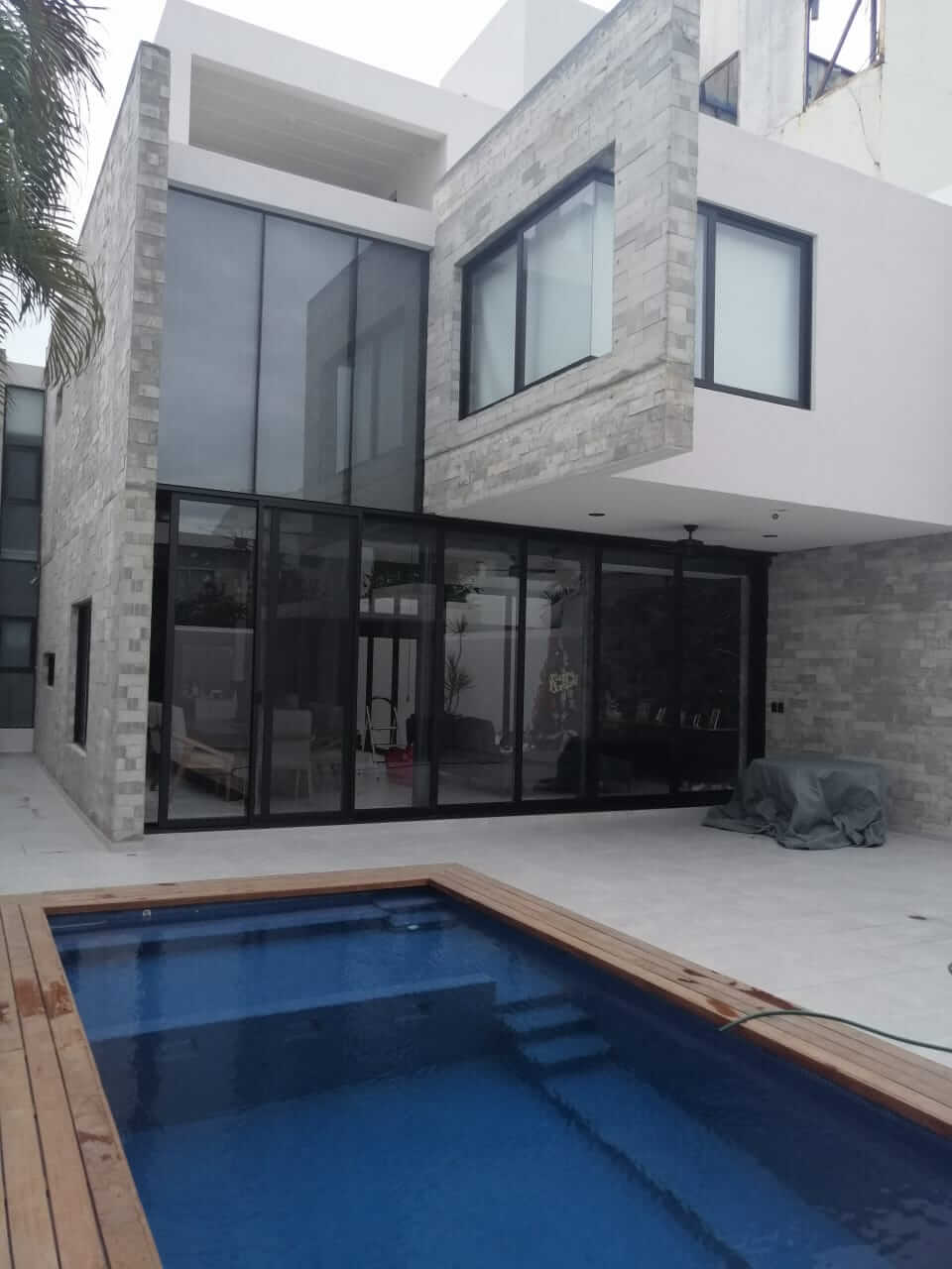 PLANTA BAJA: cochera para 2 autos, acceso secundario y principal en doble altura con gran puerta de cristal y aluminio tipo madera, despacho, baño de visitas, pasillo de servicio, patio interior, cocina, comedor y sala, terraza abierta, alberca y bar.