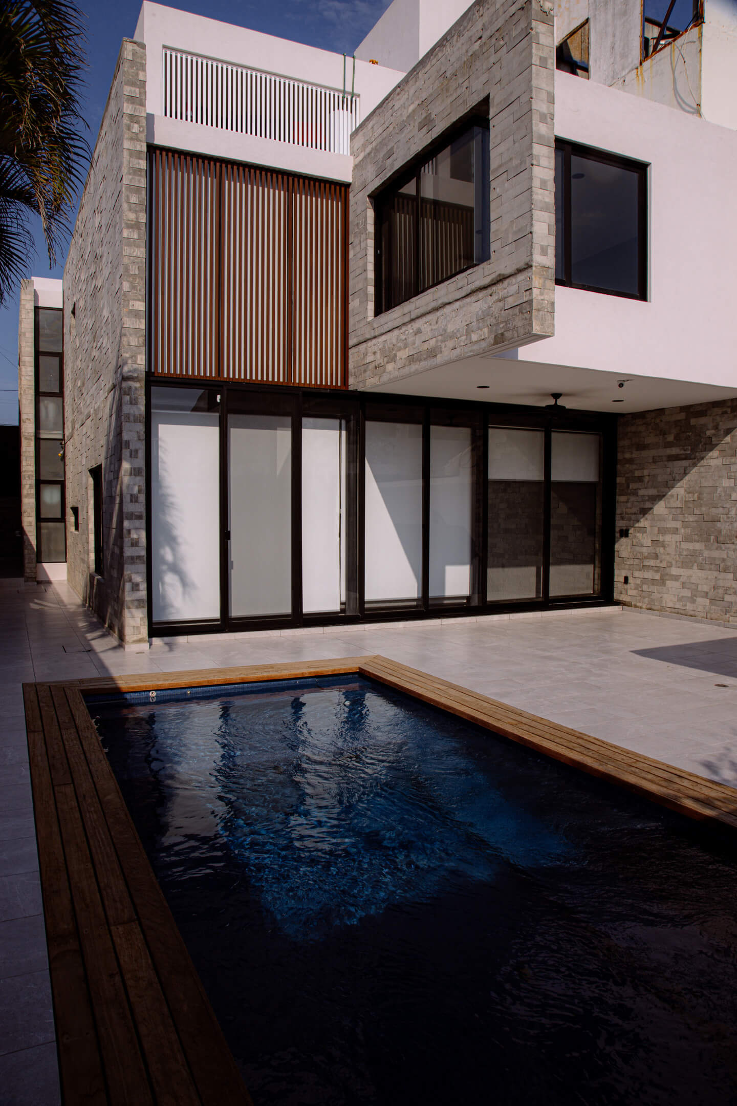 Generalmente cuando diseñamos, de manera inmediata pensamos en nuestros conceptos más comunes, volúmenes blancos controlados que privilegian la vista y la vida hacia el interior, sin embargo, en este caso según las preferencias y necesidades del cliente, así como el sitio de emplazamiento, a 500 mts de la playa de Boca del Río, quizá esas no eran las respuestas, por lo que decidimos experimentar con planos seriados que atraviesan el edificio de Este a Oeste, los cuales nos permitirían llevar el aire fresco hacia los espacios interiores.